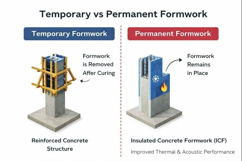 Permanent formwork, such as ICF, remains part of the finished structure. It reduces labour requirements and can improve thermal or acoustic performance, but requires careful upfront planning.